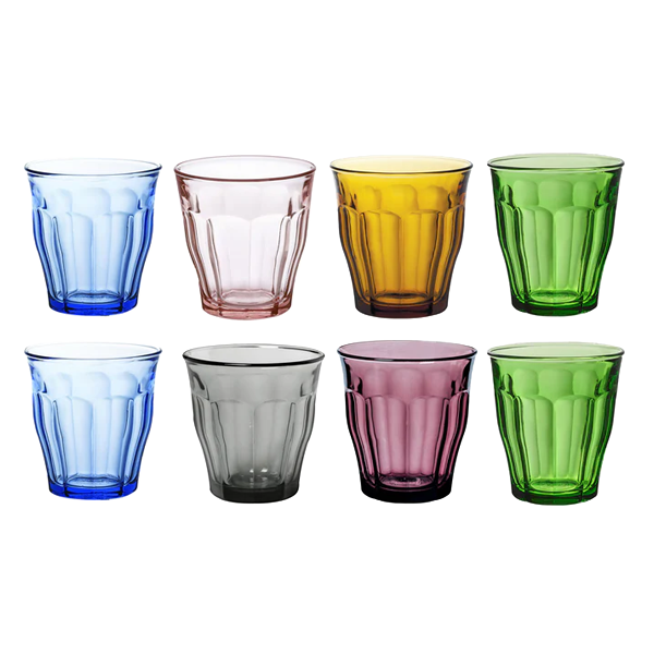 Set of 8 glasses known as the "Original French tumblers", the tempered picardie glasses are functional and stylish and they feel extremely comfortable in your hand. The picardie tempered glasses are suitable for hot or cold drinks and conveniently stackable. Perfect for kids! The perfect Marine adds ambience to every table from breakfast to evening dinners.Made in France since 1945, Duralex glass products are tempered. The mechanical and thermal resisting properties are considerably increased compared to other ordinary glassware products.